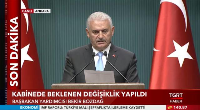 Başbakan Yıldırım, düzenlediği basın toplantısında, "15 bakanımız aynı görevini sürdürmeye devam edecek. 5 yeni arkadaşımız önce görev yapan arkadaşlardan görevi devralacak, bayrağı devralacak. 6 Bakanlar Kurulu üyemizin görev değişikliğiyle yine kabinede görevlerini sürdürecekler. Bakanlar Kurulu'muzun 11 üyesinde ya yer değişikliği ya görev değişikliği gibi bir sonuç ortaya çıkmıştır. 6 arkadaşımızın bakanlar kurulu içerisindeki görev yerleri değişmiş, 5 yeni arkadaşımız da yeni üyesi olmuştur" dedi.