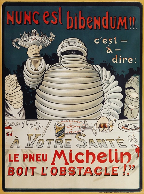 Andre Michelin hemen adamın yerine lastiklerden yapılmış bir figür koymayı önerdi ve Marius Rossillon, önceki görüntüyü Michelin'in sembolüne uyarladı. Adına da Bibendum dendi ve nihayet 1898'de tanıttılar. Bibendum Latince'de 'şerefe, hadi bir içki içelim' anlamına gelir.