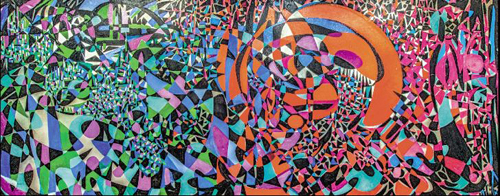 Soyut resimleriyle tanınan Fahrelnisa Zeid, büyük tuval üzerine küçük kareler, üçgenler, dörtgenlerden oluşan geometrik formları sarı, kırmızı, yeşil, beyaz ve mor renklerin en parlak, çarpıcı değerleriyle coşkuyla boyamıştır. Kontrast renkler cesaretle uyum endişesi taşımadan kullanılmış olmakla birlikte, bu zıt renkler sabırla bir araya getirilerek çok farklı, özgün ve çarpıcı bütünler oluşturmuş, ışıldayan, dağılan küçük renkli geometrik parçaların yarattığı bir ağa dönüşmüştür.