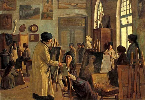Osmanlı’nın modernleşme sancılarını yansıtan bu tablo, belgesel niteliktedir. Sanatçının müdürlüğünü yaptığı İnas Sanayi-i Nefise Mektebi’ndeki (Güzel Sanatlar Kız Okulu) çalışma ortamını gösterir. Resmin arka planında görülen kadın Tors heykelleri, canlı modelin yasak olduğu dönemde kullanılan antik örneklerdir.