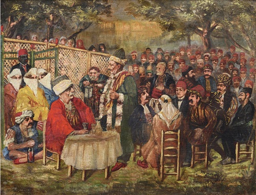 Ressam Muazzez Bey, çok uzun boylu, eskilerin "nekre" dediği komik bir mizaca sahipti. Ortaoyunu kollarına çıkıp ortaoyunu tiplerinden olan Arnavut ve Laz'ı mükemmel oynardı. Yaptığı resimlerin konularını genellikle ortaoyunu kompozisyonları, sünnet düğünleri, Karagöz sahneleri gibi milli eğlenceler ve geleneksel oyunlardan seçmiştir. Ayrıca portre türünde çok başarılı olmuş ve iyi bir portreci olarak kabul edilmiştir.